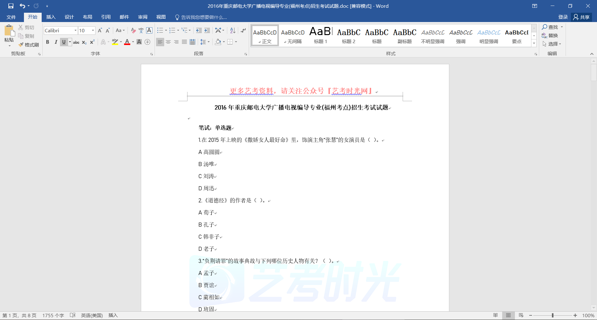 2016年重庆邮电大学广播电视编导专业(福州考点)招生考试试题