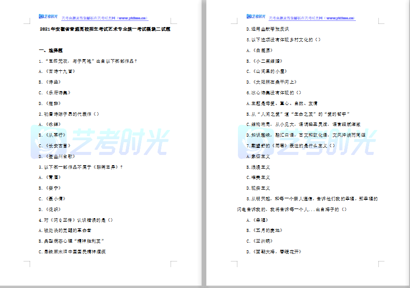2021年安徽省普通高校招生考试艺术专业统一考试模块二试题