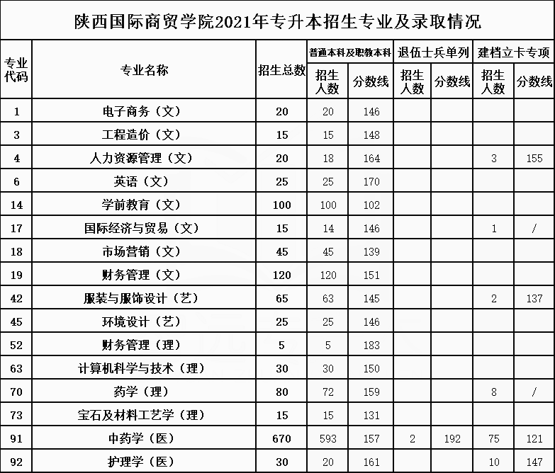 陕西国际商贸学院在2021年陕西省统招专升本招生中,共设专升本招生专业16个,其中文史类专业8个,艺术类专业2个,理工类专业4个,医学类专业2个。共计招生人数1280人,其中招生最多的专业是中药学(医),共计招生670人,也是该专业唯一的一所升本院校。