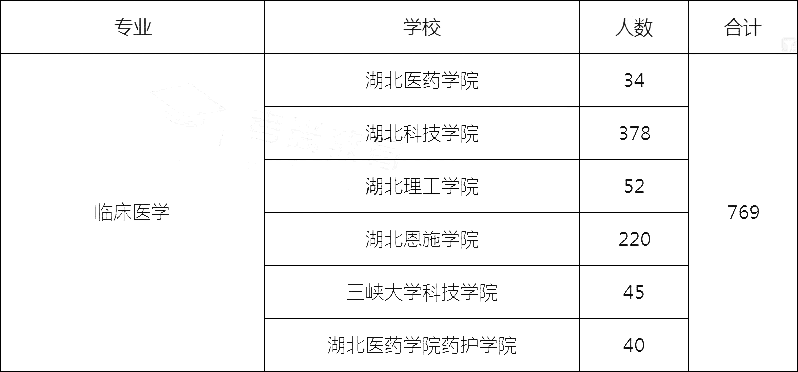 湖北专升本中,有临床医学专业专升本招生计划的院校一共有6所,招生人数共769人。