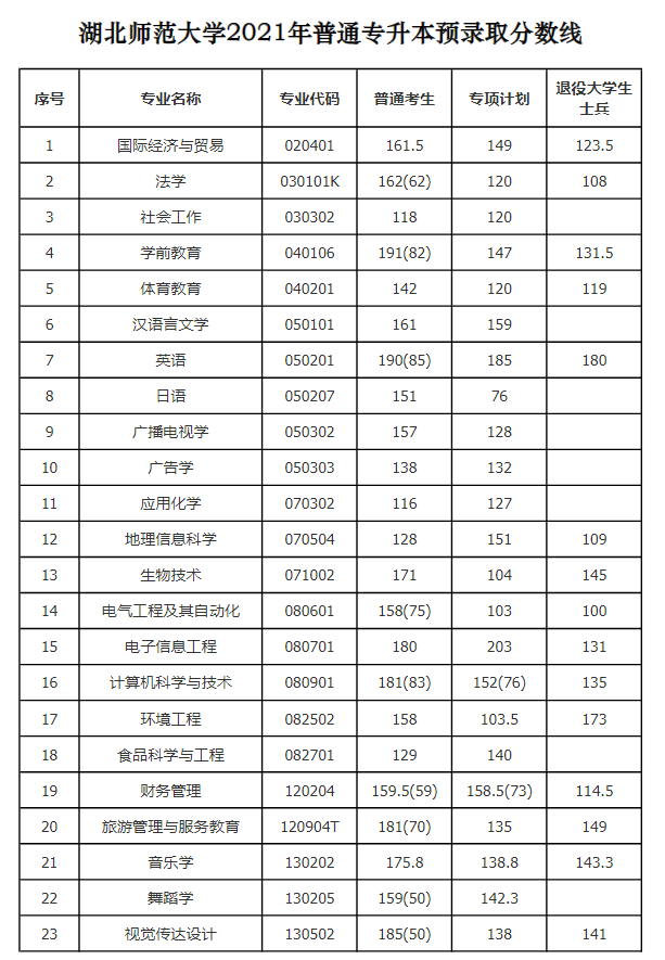 预录取分数线的划定按照《湖北师范大学2021年普通专升本招生简章》公布的普通专升本录取原则,对照录取计划进行。我校“退役大学生士兵”录取计划35人,预录取35人;“专项计划考生”录取计划143人,预录取143人;普通考生(含专项计划)录取计划867人,预录取869人(电气工程及其自动化、视觉传达设计专业分别有两个考生专业成绩、英语成绩、总成绩完全相同,按规则都录取)。