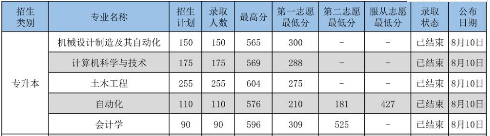 按考试总成绩(统考科目、专业综合课、技能考核成绩总和)划定,最低录取资格分数线为165分,其中技能考核成绩为60分。