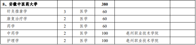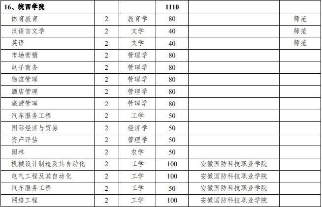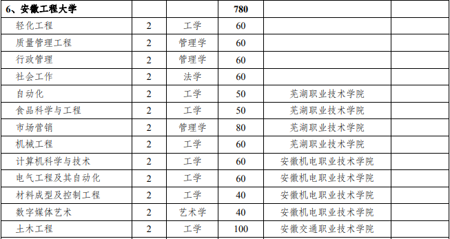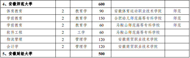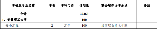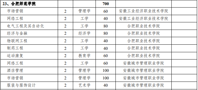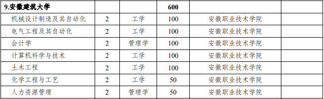 2020年开始,安徽开展并逐步扩大本科院校与优质高职院校联合开展应用型人才培养试点。试点的高职院校为进入“双高计划”的高职院校、安徽省地方技能型高水平大学以及部分特殊类型高职院校(艺体类、师范类、医药类),培养地点设在高职院校。每所试点高职院校只能与1所本科院校开展联合培养试点,各本科院校同一个专业只能选择联合培养或非联合培养一种模式。具体试点院校和试点专业情况见各校招生简章,学生在报名时可自主选择。