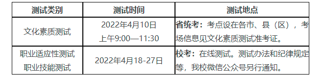 (3)退役军人免文化素质测试,须参加我校组织的职业技能测试(中职毕业生)或职业适应性测试(除中职毕业生以外的其他考生)。