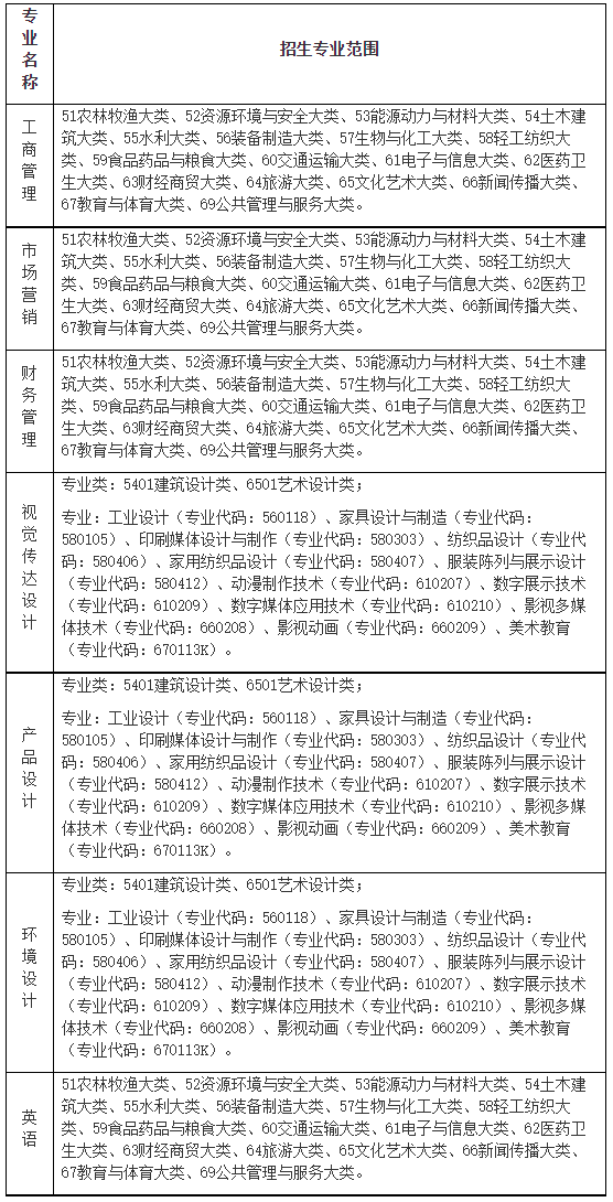 a.申请调剂的专业与原报考专业公共课考试科目相同、专业类别一致,不接受跨专业类别调剂;b.公共课达到省考试院统一划定的分数线且未被任何学校录取(填报免试退役士兵计划调剂志愿的考生除外);c.毕业专业须符合我校招生专业范围要求;d.校外调剂专业要求:工商管理、市场营销和财务管理专业(拟调剂专业)接收工商管理、市场营销、财务管理、行政管理、电子商务、物流管理、酒店管理、旅游管理、人力资源管理、会计学、审计学、工程造价、物流工程、劳动与社会保障、房地产开发与管理、健康服务与管理和资产评估专业(原报考专业)调剂,视觉传达设计、产品设计和环境设计专业(拟调剂专业)接收视觉传达设计、产品设计、环境设计、动画、绘画、美术学和数字媒体艺术专业(原报考专业)调剂,英语专业(拟调剂专业)接收英语和商务英语专业(原报考专业)。