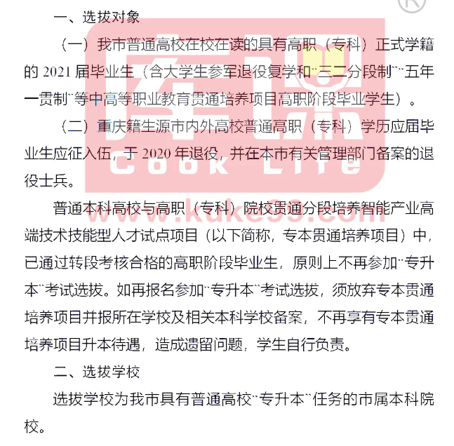 2021年吉林省普通高职高专院校应届毕业生。选拔方式:省教育厅统一组织选拔考试,按考试成绩和录取比例择优选拔。