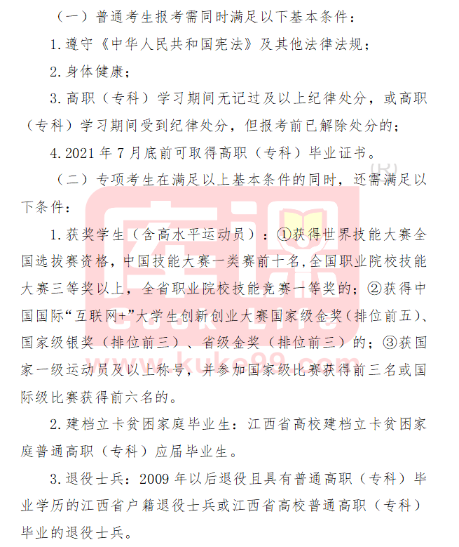 (1)我省普通全日制高职(专科)2021年应届毕业生,且截止2021年8月31日取得当年应届普通专科毕业资格(获得毕业证书),或具有我省高职(专科)学历的退役士兵;