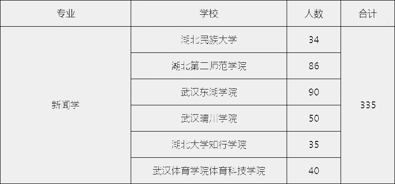 湖北专升本中,有新闻学专业专升本招生计划的院校一共有6所,招生人数共335人。