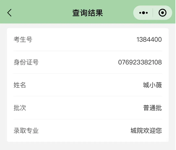 三、输入身份证号和姓名就可以查询到自己的录取结果