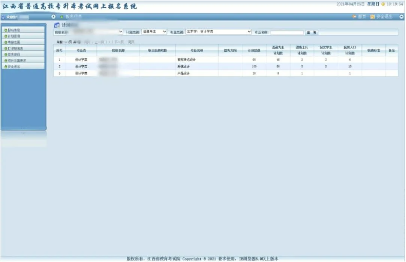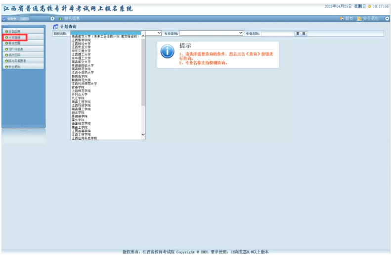 四、点击左上方“计划查询”,查询院校名称、专业类别、专业名称及各类招生计划。