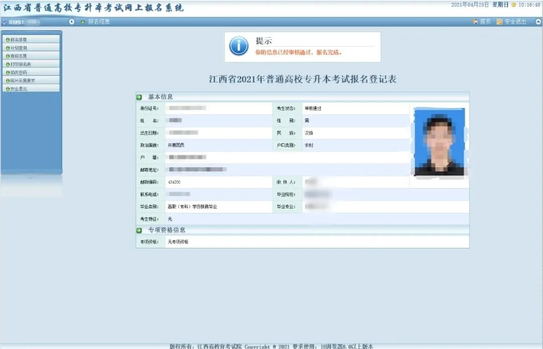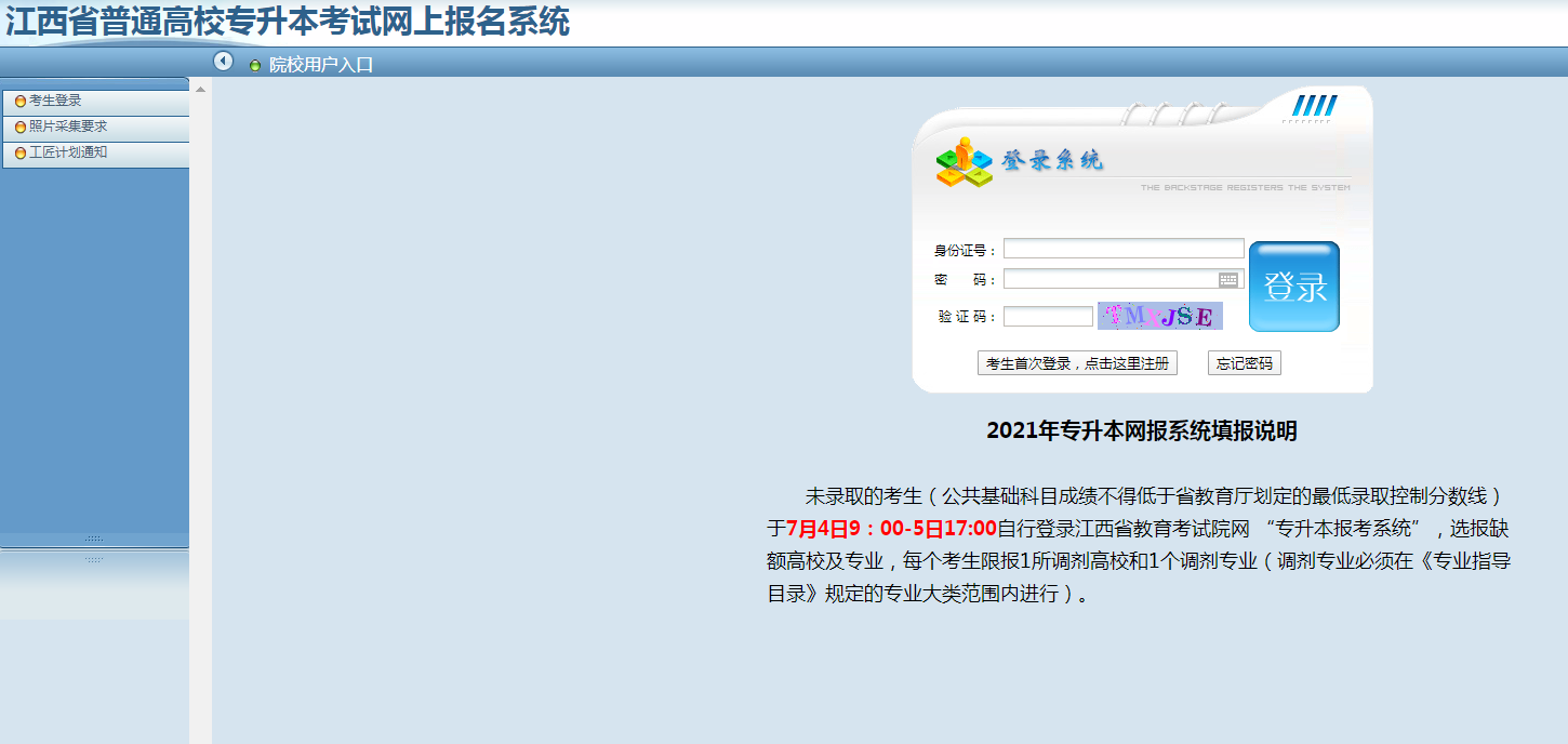 满足2021年专升本调剂资格的考生(公共基础课85分及以上)务必于2021年7月4日9:00-2021年7月5日17:00登录江西省教育考试院网(网址:www.jxeea.cn)“专升本报考系统”,根据招生专业及计划表,对照《江西省2021年专升本对应专业指导目录》填报对应本科专业。