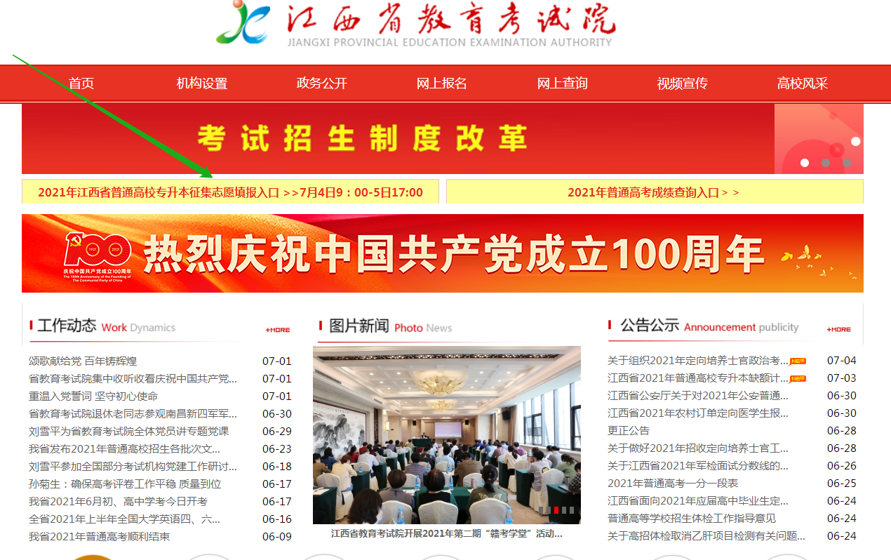 一、登陆江西省教育考试院官方网站(网址:www.jxeea.cn),点击专升本征集志愿填报入口。