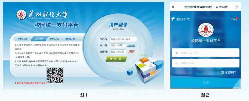 在浏览器地址栏输入 http://pay.lzufe.edu.cn/至校园统一支付平台页面,如图 1所示。或用手机微信关注“兰州财经大学财务处”公众号,进入“兰州财经大学财务处”公众号,选择“学生缴费/学费缴纳”至校园统一支付平台页面,如图 2所示。登录用户名为身份证号,密码为身份证号后 6位(末尾是字母的请大写)。