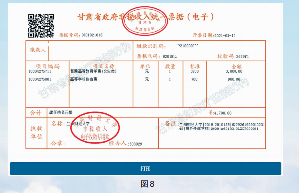 缴费完成后登录甘肃省政务服务网统一公共支付页面,输入手机中收到的缴款码和交款人姓名,即可查询打印发票,如图 8所示,该发票只能打印一次,请学生务必妥善保管。