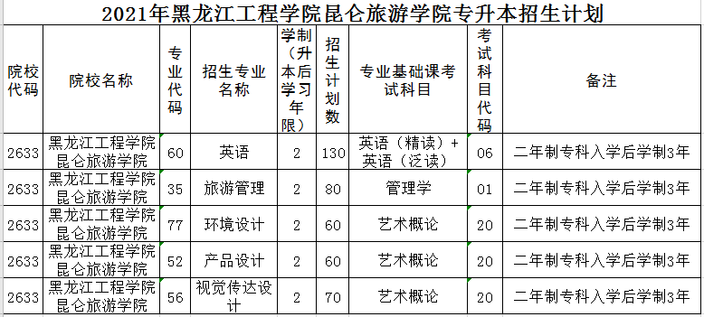 2021年黑龙江工程学院昆仑旅游学院专升本招生计划已公布,专升本招生专业一共有5个,下面库课小编给大家分享一下黑龙江工程学院昆仑旅游学院2021年专升本各专业具体招生情况,考生可以看看。