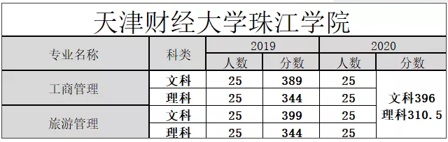 2019年-2021年的天津财经大学珠江学院专升本分数线最高的是2021年工商管理专业,为416分,最低的则是2020年理科分数线为310.5分。