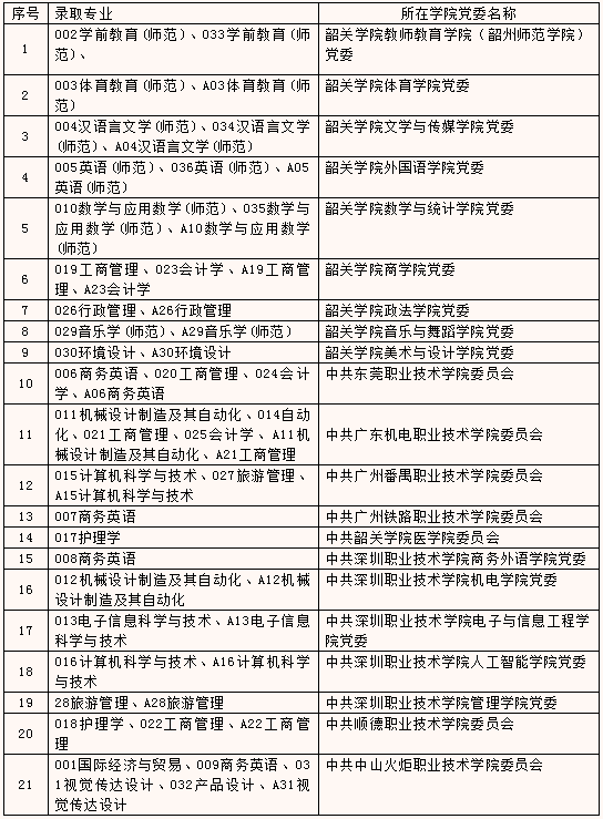 接收基层党组织为录取学院党委:韶关学院**学院党委,如:韶关学院外国语学院党委。详见上表。