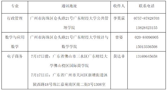 三、普通专升本新生录取通知书、调档函等预计于8月初寄出,请各位考生保持联系方式畅通。如需更改收件地址,请及时与学校联系,电话:020-84096844;e-mail:zsbbg@gdufe.edu.cn。