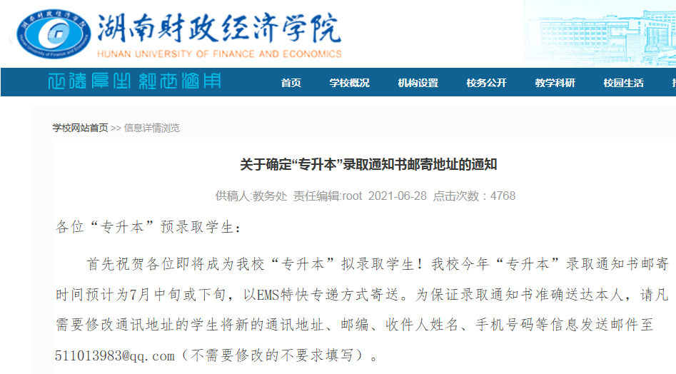 湖南财政经济学院发布了关于确定“专升本”录取通知书邮寄地址的通知,提醒被录取考生须在规定时间内修改,逾期不再受理。